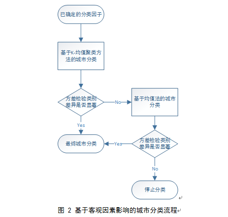 选取人均GDP、二产比重、城市化率、水资源量等作为影响城市水效的客观因子。基于影响因子的城市分类方法如下:第一,在遵循服务于标杆制定、逻辑分析与实证研究相结合,以及数据可得性等原则的基础上,采用多元加权回归方法,判断各影响因子对城市水效指标影响的强弱水平;第二,对影响因子按照从强到弱的顺序排列,影响最大的因素优先用于分类,每次分类结果作为下一次分类的开始;第三,采用K-均值聚类法和均值法,确定类别的分界点,得出城市分类结果;第四,对每一项分类结果进行显著性方差检验,验证分类结果是否合理,若检验不显著则停止分类。具体分类流程见图1。