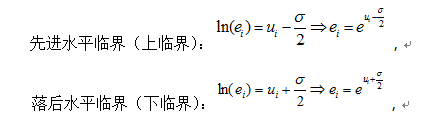 水效标杆应体现动态性、相对性的特征。标杆是指测量或者评价的参照点,因此我们需选择分组比率即先进水平、中间水平和落后水平之间的比重,进而确立不同水平的理论分布分位数,即标杆。用ei表示城市水耗效率,分别为万元GDP水耗,万元工业总产值水耗、人均综合水耗、人均生活水耗。假定满足对数正态分布。从界定水耗效率的先进、中等与落后水平的角度出发,进行如下界定,确定标杆的计算公式: