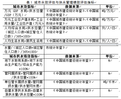 城市水效评估指标包括综合生产、工业生产、社会生活等方面的水耗指标,具体为:万元GDP水耗、万元工业总产值水耗、人均综合水耗、人均生活水耗;城市供水管理绩效评估指标包括取水、生产能力、输送漏损等方面的供水管理绩效指标,具体为: