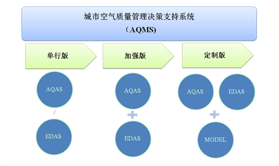 城市空气质量管理决策支持系统包括:空气质量连续监测数据分析系统、空气污染源监测数据分析系统和空气质量预测诊断系统三个模块。系统可以按照三种版本提供服务,即单行版、加强版和定制版,如下图所示: