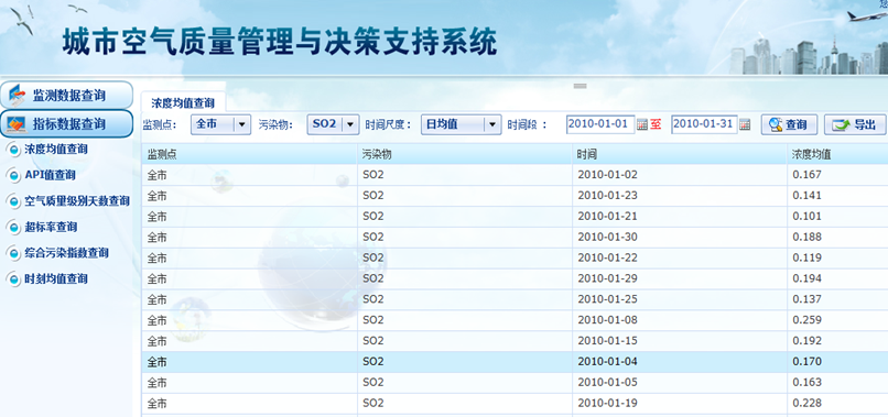 空气质量连续监测数据的完整和系统分析和展示。对空气质量标准中的所有污染物开展分析。其中,计算指标包括:小时值、日均值、周(日)均值、月(日)均值、季(日)均值、期(采暖/非采暖)日均值和年(日)均值;分析指标包括现有和新空气质量标准的污染物小时浓度、8小时滑动平均浓度、日超标率、API(AQI)、二级标准天数、综合污染指数等指标;并包括所有指标的同期比较分析和不同监测点、不同污染物、不同时段的比较分析。所有分析结果可基于GIS进行查询和展示。